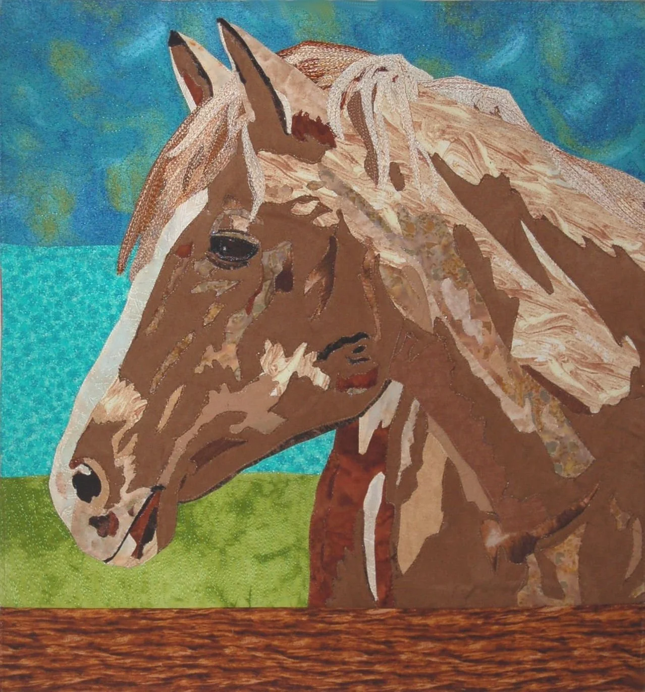 The faces were sketched on fabric and fused to a heavy-weight stabilizer. Hair and clothing were freehand cut and tacked in place. Each piece was thread painted and colored with pencil, inks and pastels, before appliquéing to the quilt block.