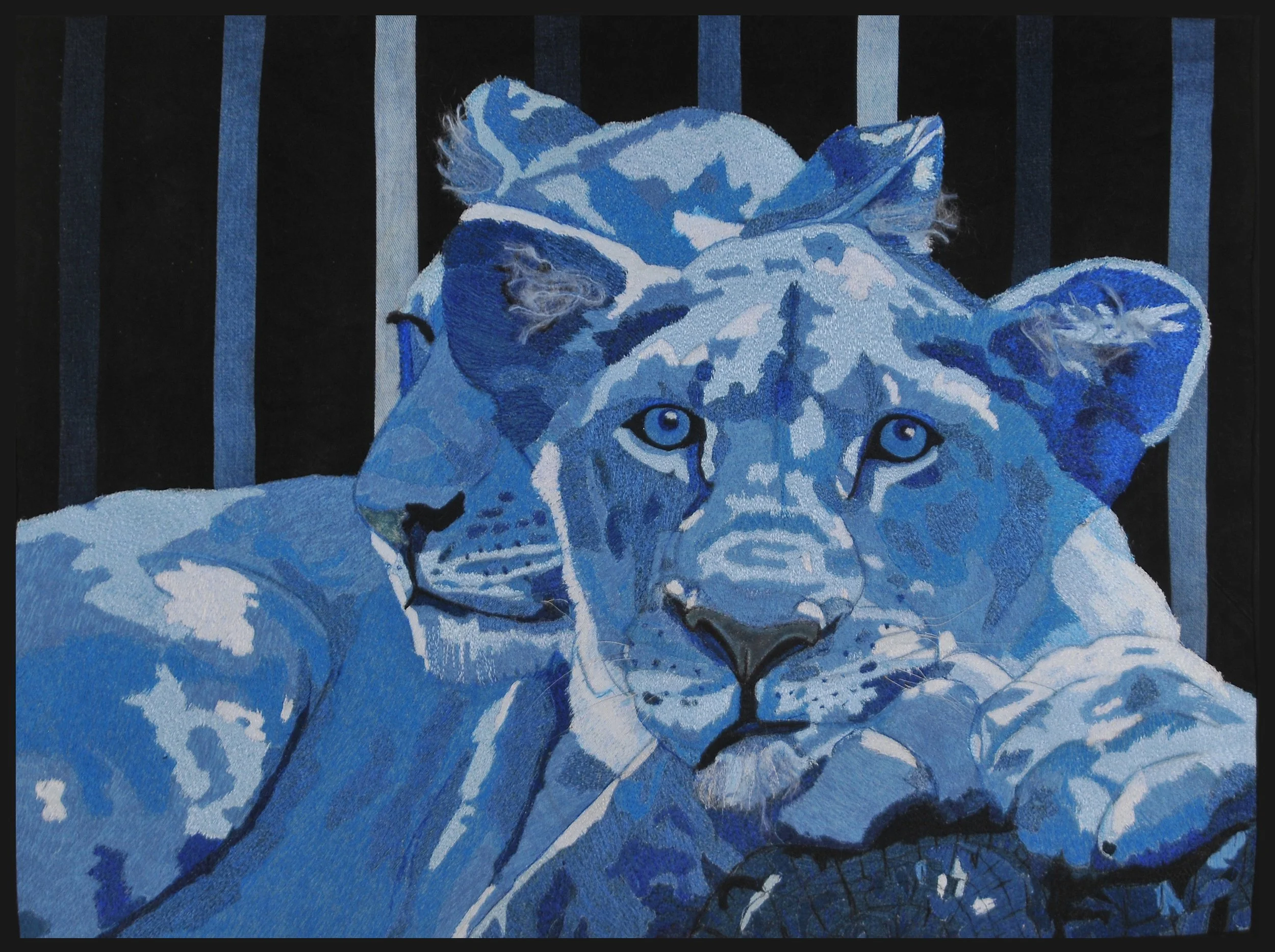 This quilt is made of entirely recycled materials. It uses 10 shades of denim jeans including black and white. The collaged lions are covered with over 2000 yards of thread. This quilt won Best of Show and Best Use of Color at the Danville Art Center’s second look show.