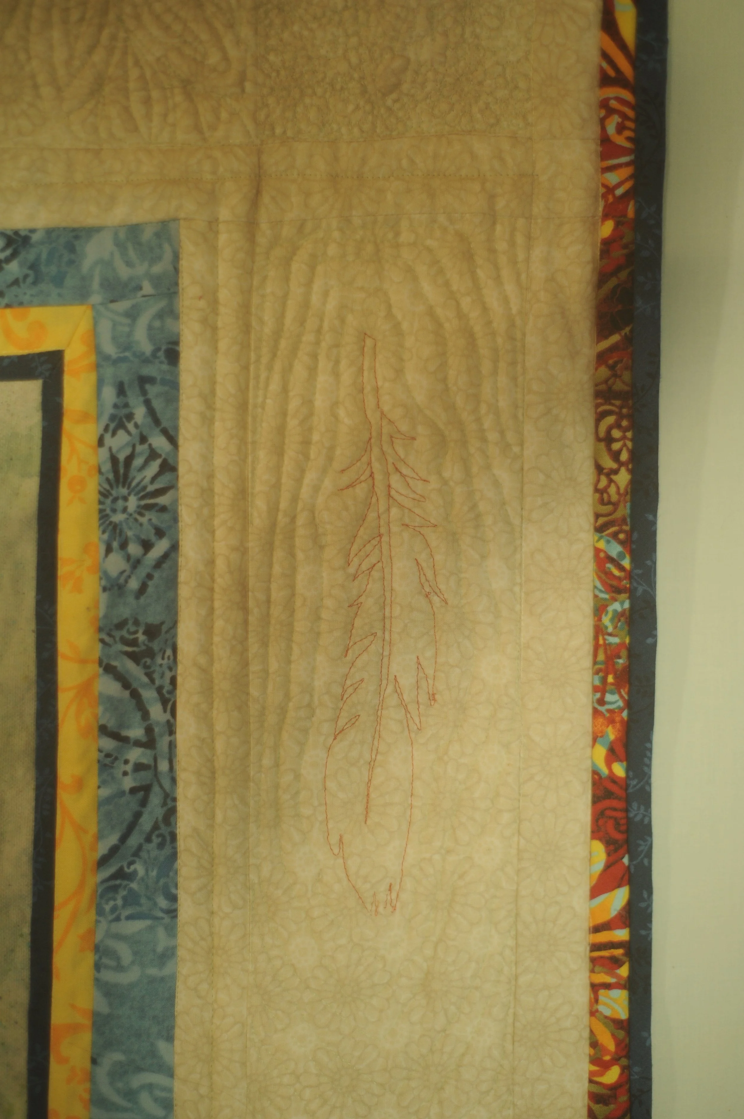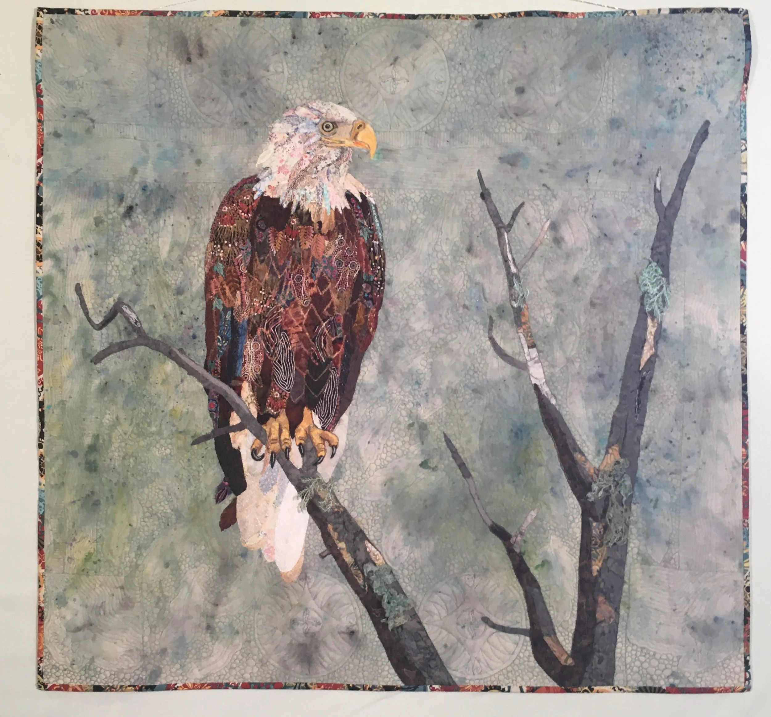 This quilt is made on a painted background. Eagle feathers are individual collaged fabric pieces. Tree lichen is made of free_motion stitching on water soluble fabric.