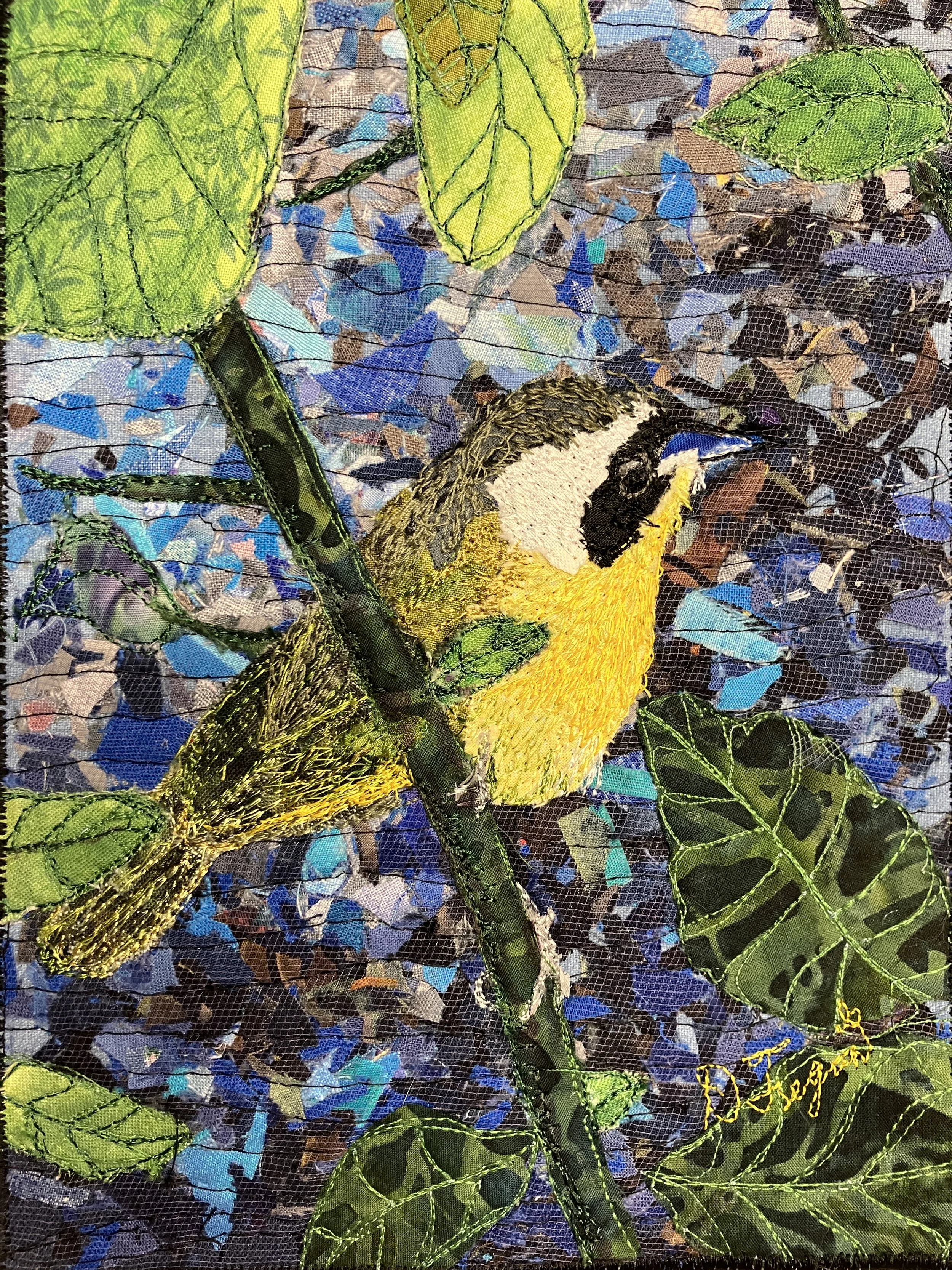 Common Yellow Throat Feb 9 Written By Dolores Fegan I finished this little bird last week. It is a common yellow throat. art quiltscommon yellow throatcnfetti quiltsthread painting Dolores Fegan https://DoloresQuilts.com