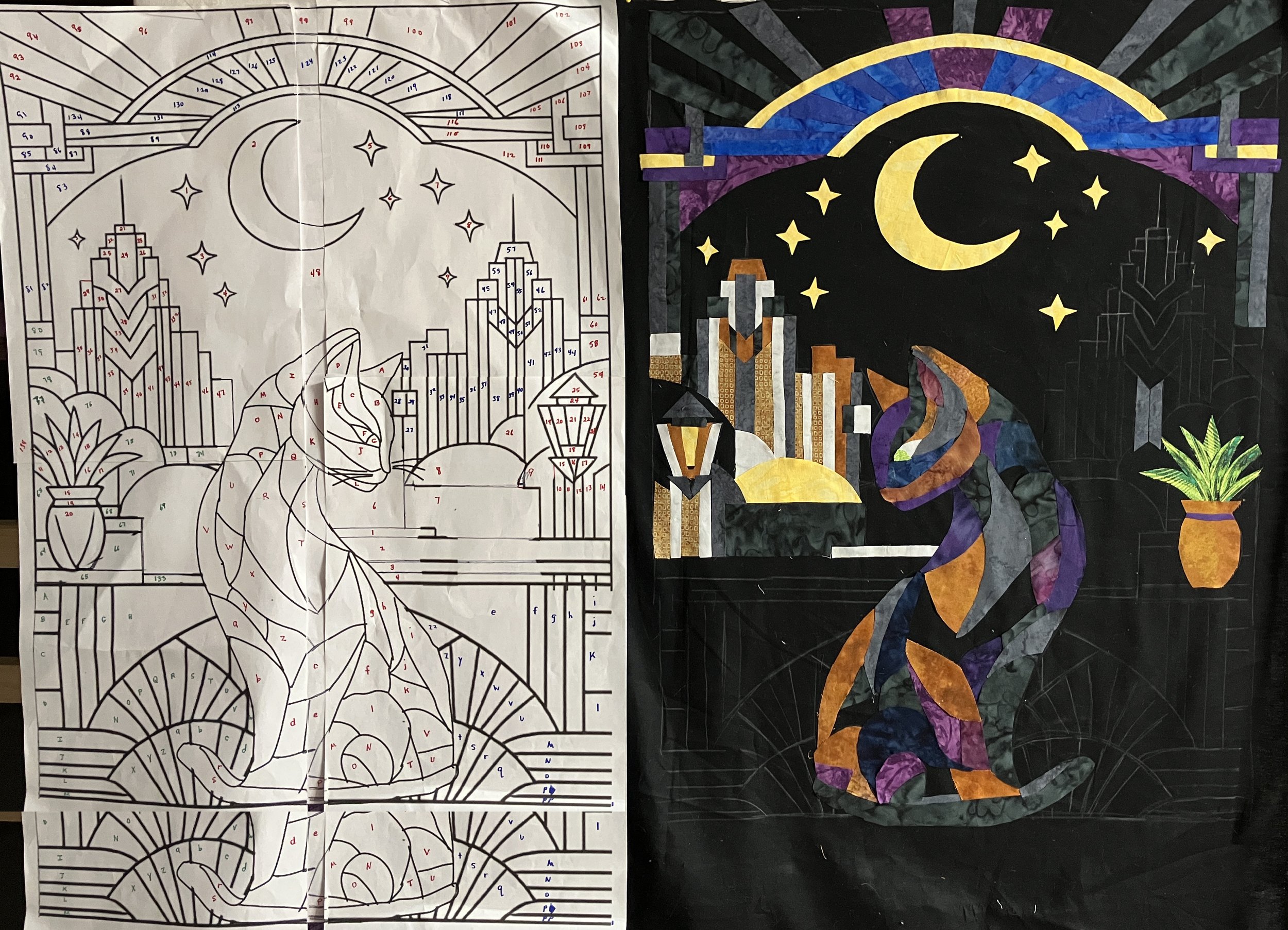 My pattern and beginning of appliqué pieces. You can see I forgot to reverse the pattern when creating the fused pieces so instead of wasting pieces I just reversed the moon and finished what I started.