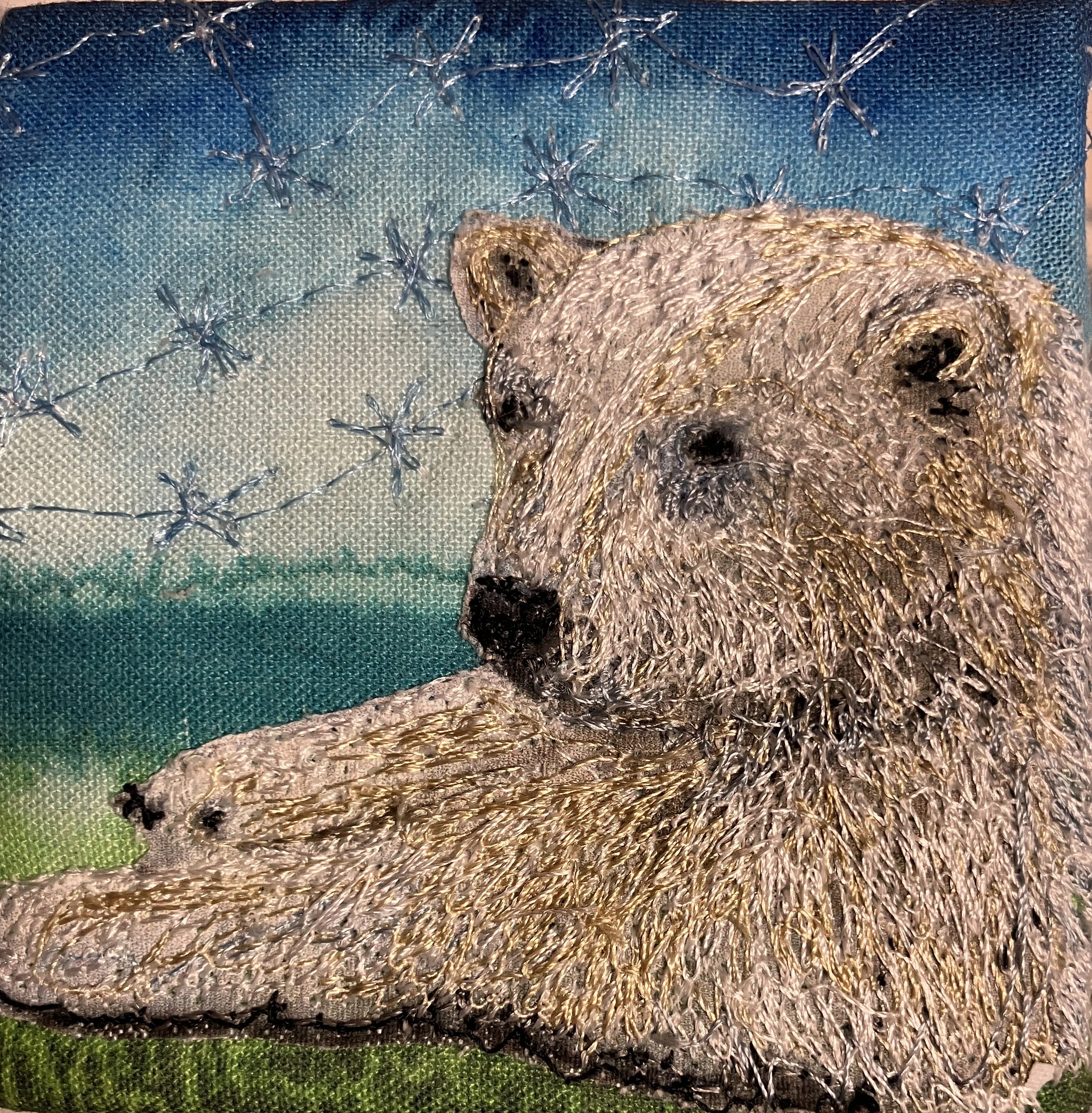 This week’s project must fit in your hand. I decided to make a new 3” by 3” piece designed to sit on a tiny tabletop easel. I created a polar bear rendered with thread painting on a small square of fabric layered with batting and a backing. When the stitching was finished I mounted the work onto a 3” canvas by carefully wrapping the fabric around the stretcher and stapling it to the back of the wooden frame. For this miniature I used eight different colors of thread to build depth and subtle detail.