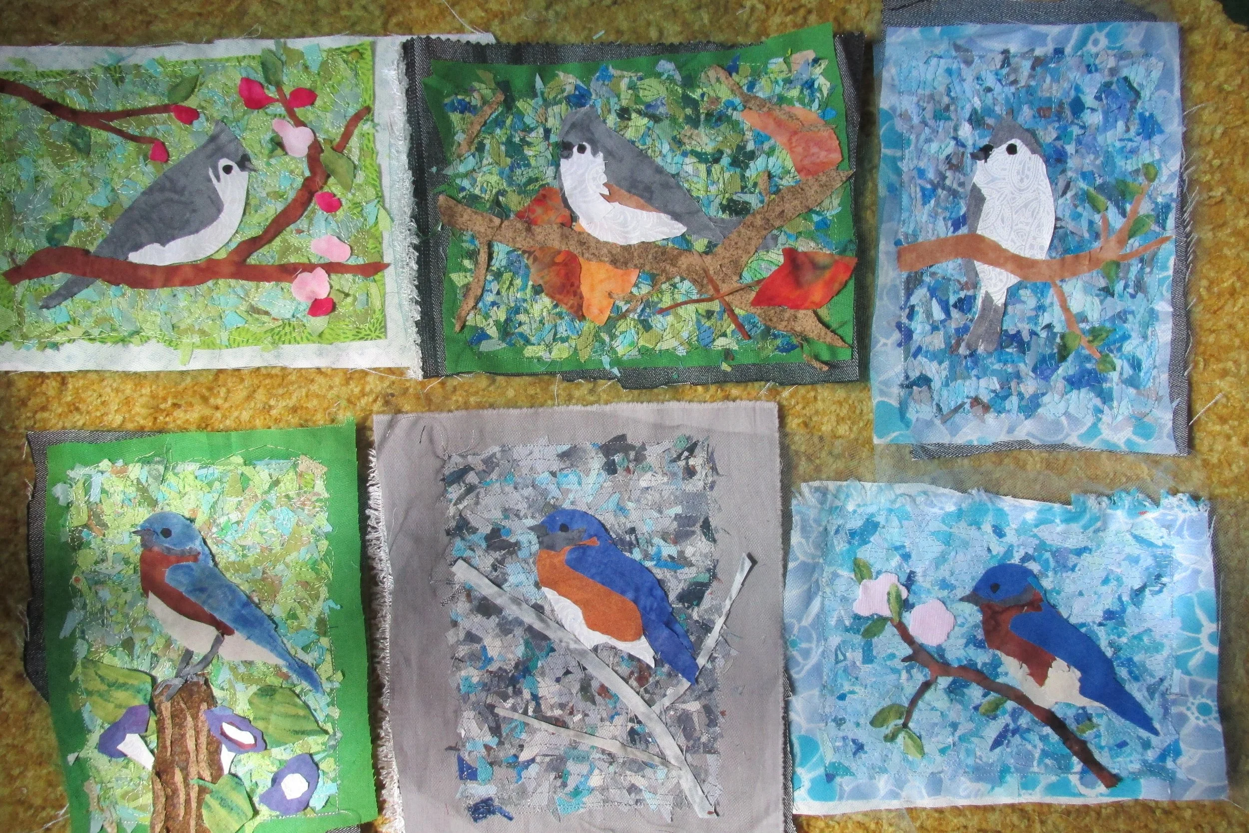 Thread painting is done by moving the fabric under the sewing machine and using the needle as a pencil. Shading is done by changing the thread color. This time consuming process is what gives the birds their realistic look.